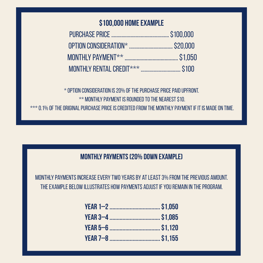 20 percent of the purchase price plus closing costs (up to 5%) is required as Option Consideration. This is credited toward your future purchase when you buy the property.