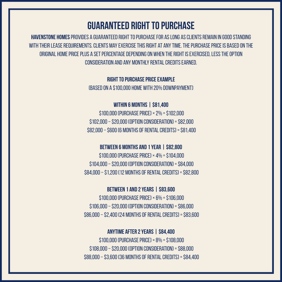 Right to Purchase price is set at the original home price plus 2 percent if purchased within 6 months, 4 percent if purchased within 1 year, and 6 percent if purchased anytime after 1 year